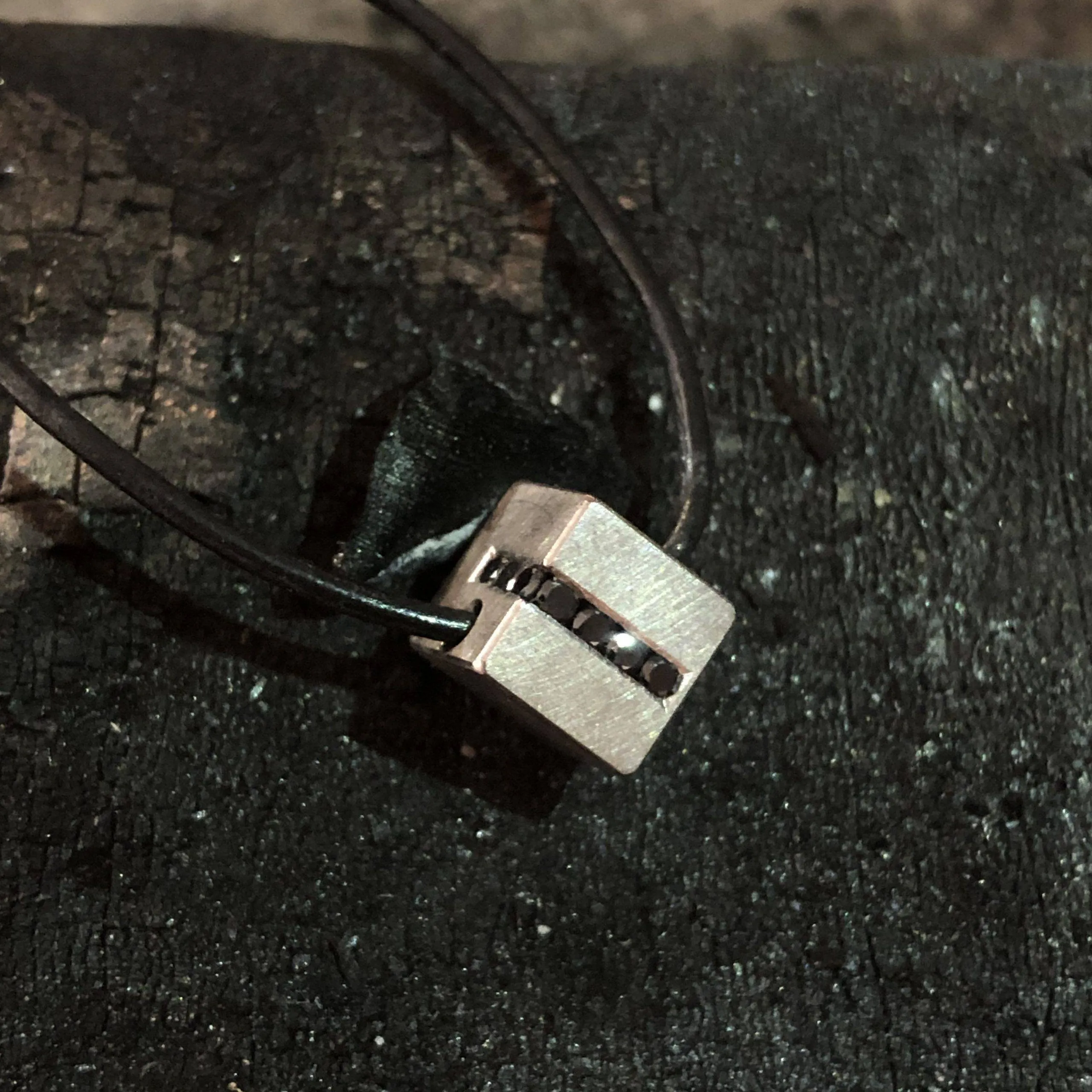 7 schwarze Diamanten eingebettet in einen Würfel aus Weißgold. Ein Strahlen in geometrischer Form