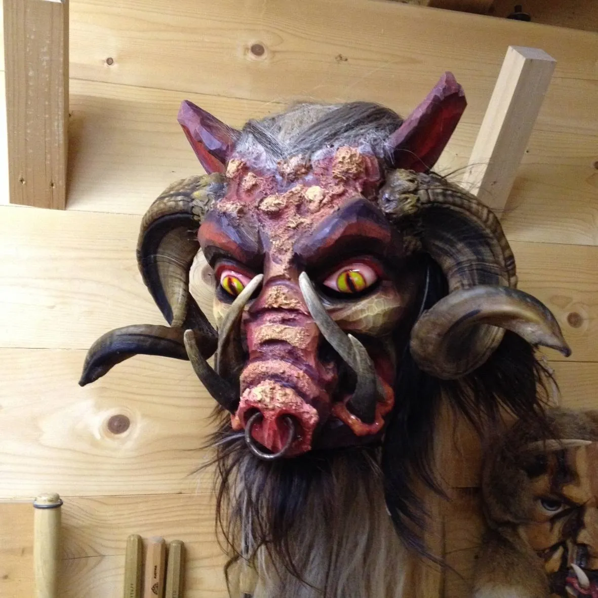 Im süddeutschen Raum und in Österreich finden sich junge Männer zusammen um als Perchten und Krampusse das Böse und / oder den Winter zu vertreiben. Dabei müssen sie möglichst grauselig aussehen und daher verkleiden sie sich mit außergewöhnlichen Masken und Gewandungen. Sie müssen so aussehen, damit der Winter oder das Böse davor erschreckt. Als „Pässe“, also einzelnen Gruppen (oft mit bestimmtem „Style“) ziehen sie dann durch die Wälder, Dörfer und Städte. Man sollte ihnen dabei nicht zu nahe kommen. Durch eine Kooperation mit dem Maskenschnitzer Hansi Schwabl aus Innzell (Huattai Loavn), ergab sich dieses besondere Kleinod. Es gibt also zu diesem Schmuckanhänger eine originale Maske, die vor Ort auch getragen wird.