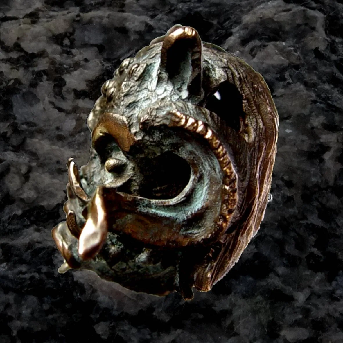 „Saukopf“ Perchtenmaske, Krampusmaske, Bronze, patiniert / ca. 25 mm hoch, 15 mm tief