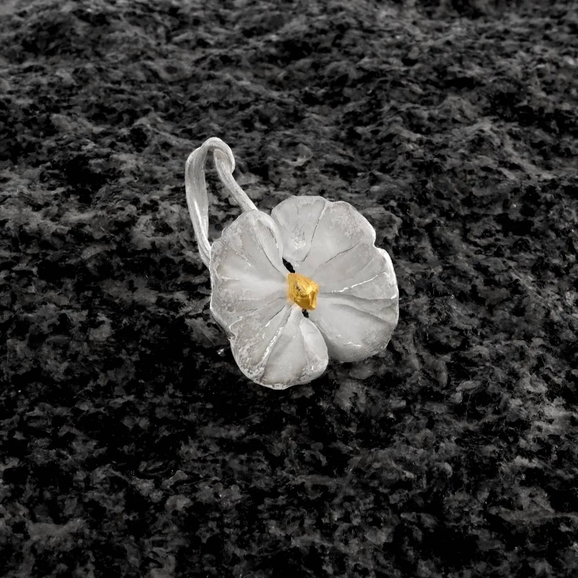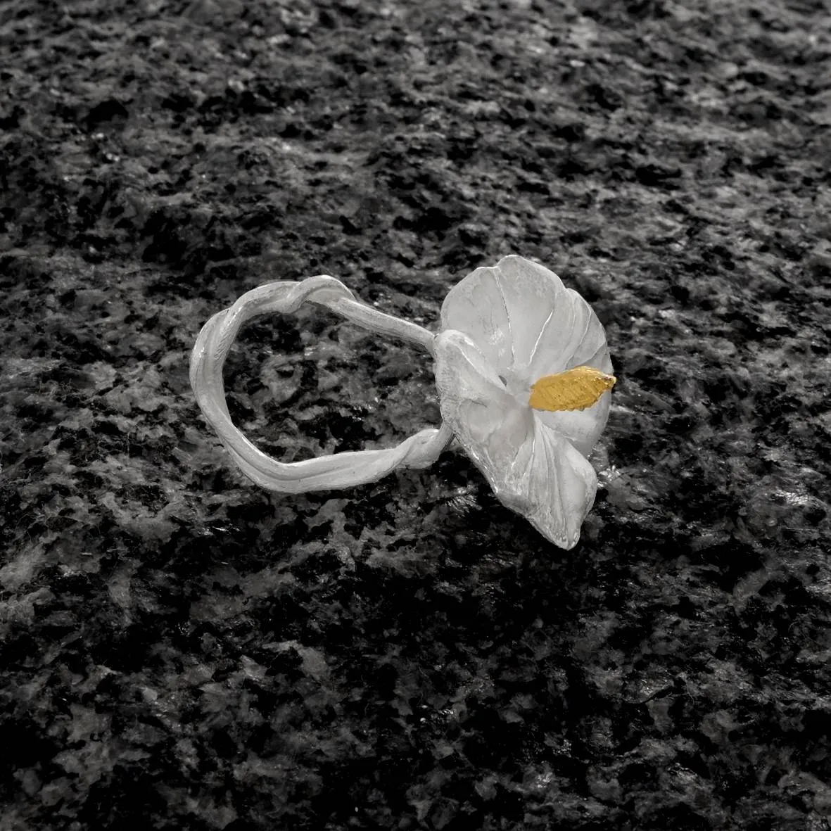 Der Ring wird als „Zwischenfingerring“ getragen – Die Blüte kommt zwischen zwei Fingern zu Ruhe.