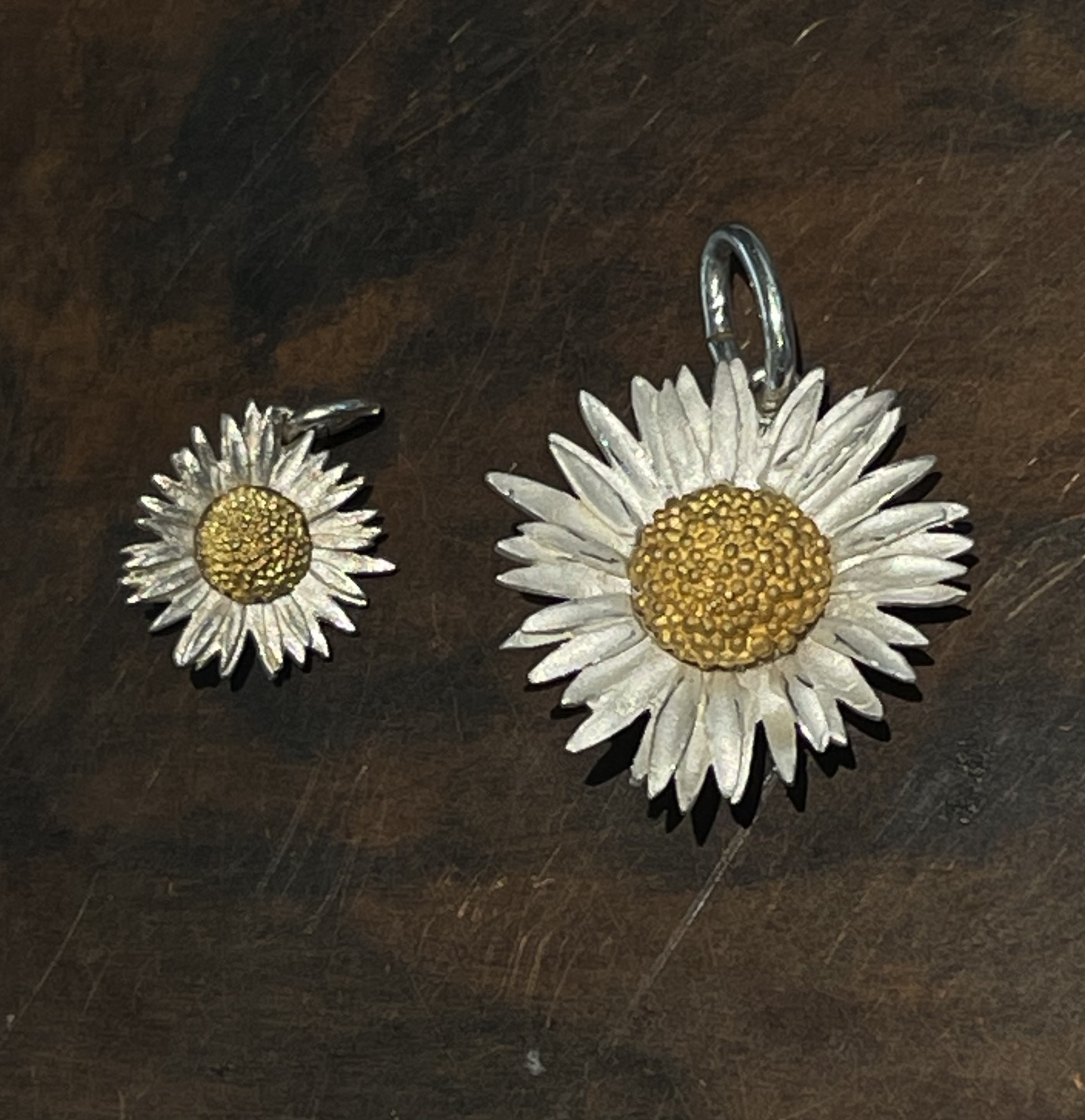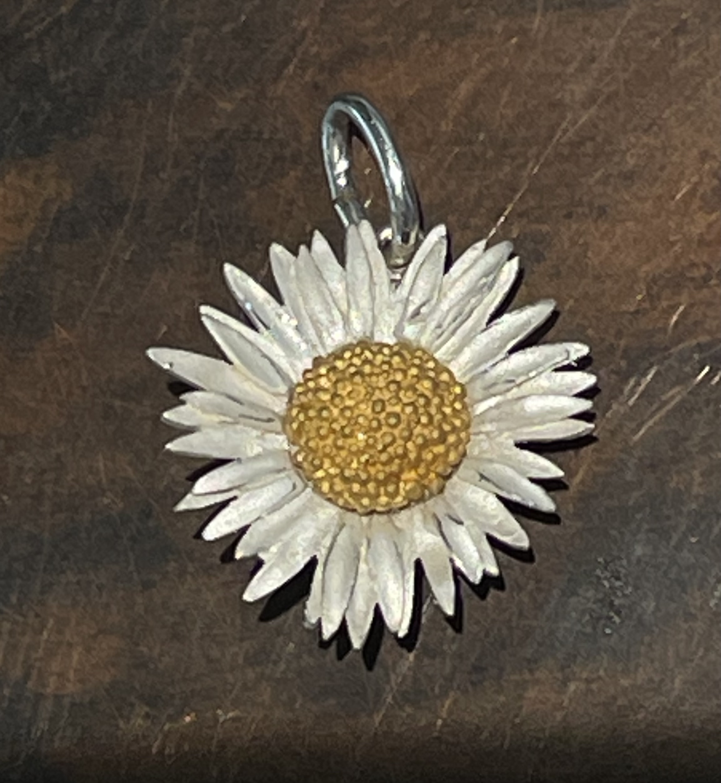 Gänseblümchen Ring Maximus (1 Blüte), weißgesiedeter Ring 925/°°° Silber (schneeweiß) mit Blütenstempel 900/°°° Gelbgold, Durchmesser ca. 18 mm (erhältlich auch als Piccolo in 11 mm Durchmesser). Jede Ringweite möglich, hier ca. 49,5 mm Umfang.