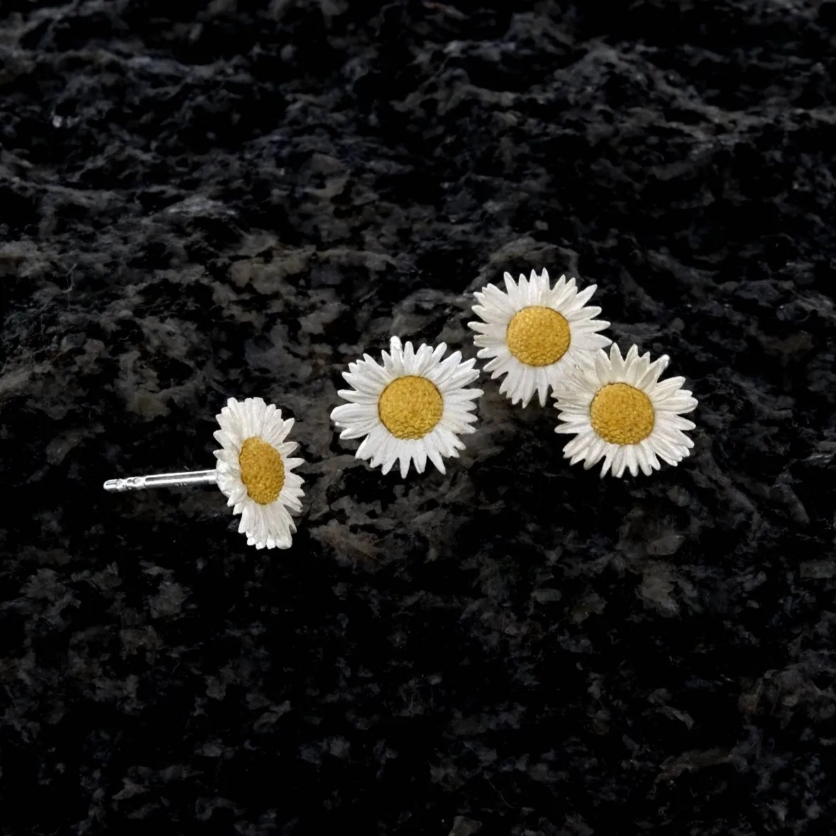Die Töchter zu unserem allzeitbeliebten Gänseblümchenring. Etwas kleiner (ca. 11 mm Durchmesser), etwas feiner zaubern sie die Lebenskraft der bellis perennis in uns hinein. Alle Zeit blühend eben. Wie auch der Ring in weißgesiedetem Silber (schneeweiß) und mit einem Blütenstempel aus massivem 900/°°° Gelbgold per Goldschmiedehand gearbeitet.