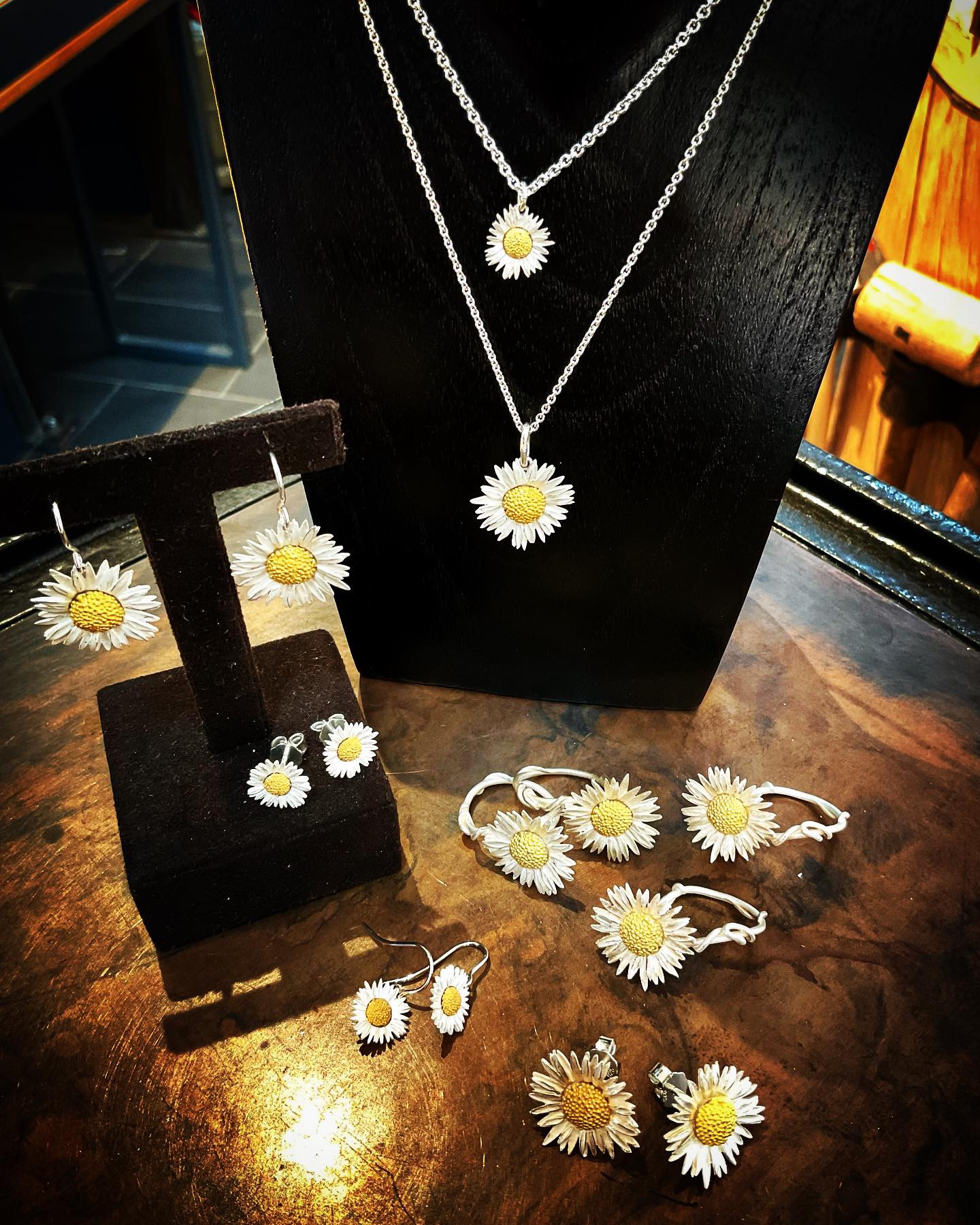Die Töchter zu unserem allzeitbeliebten Gänseblümchenring. Etwas kleiner (ca. 11 mm Durchmesser), etwas feiner zaubern sie die Lebenskraft der bellis perennis in uns hinein. Alle Zeit blühend eben. Wie auch der Ring in weißgesiedetem Silber (schneeweiß) und mit einem Blütenstempel aus massivem 900/°°° Gelbgold per Goldschmiedehand gearbeitet.