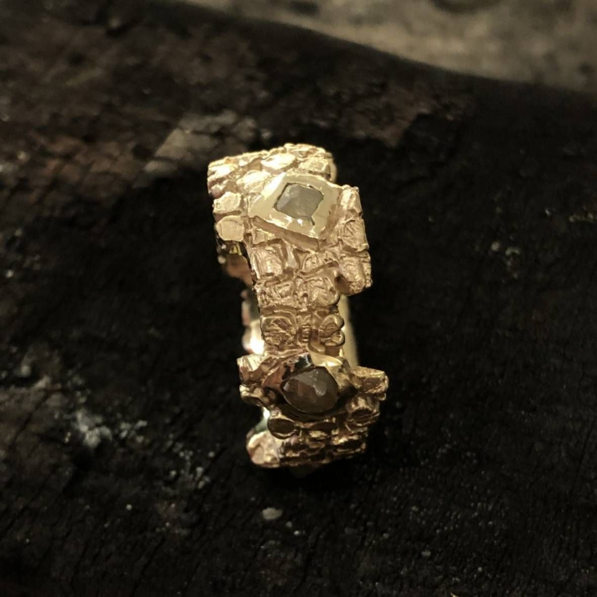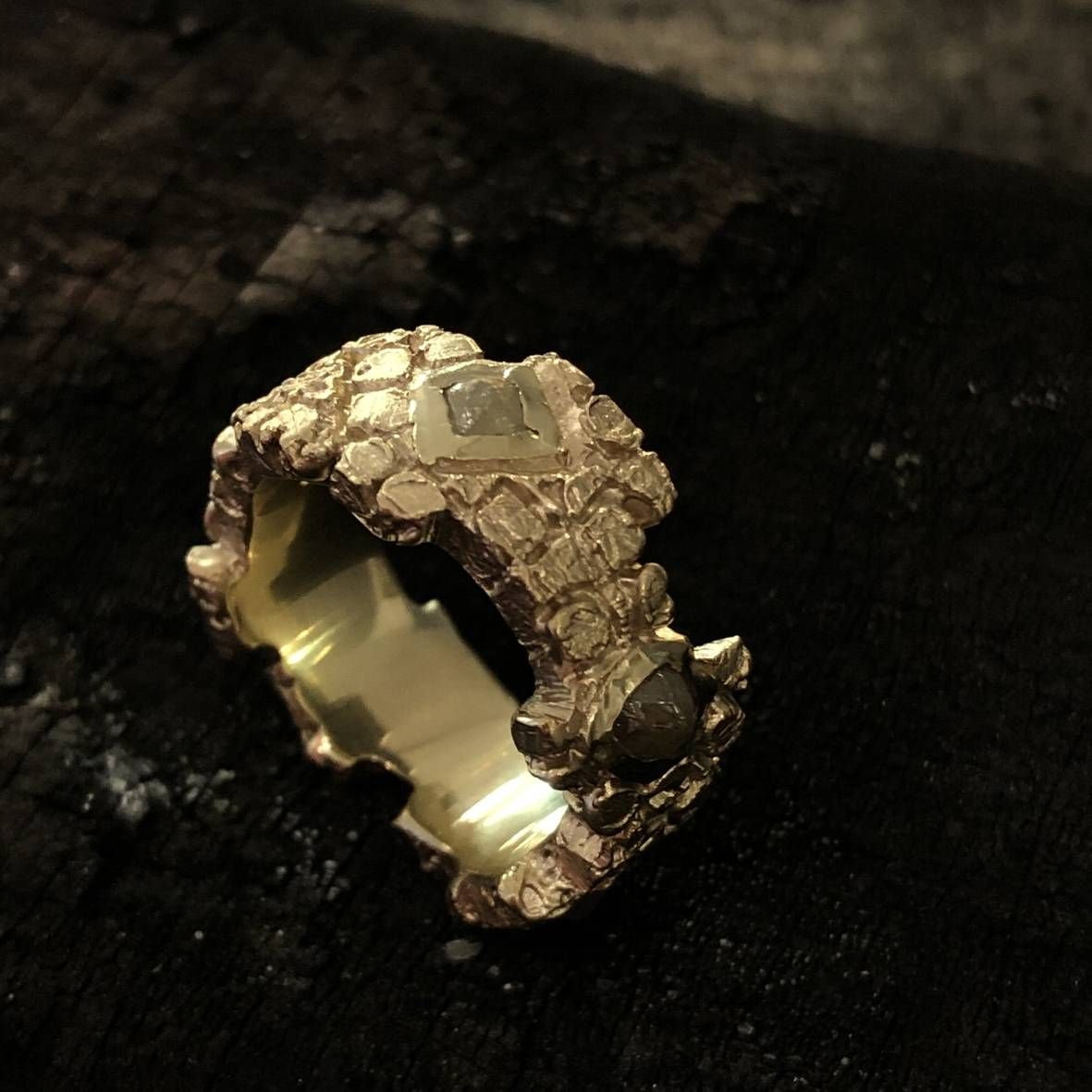 585/°°°Gelbgold, Ringweite 58, ca. 9,5mm breit, 5 Rohdiamanten |