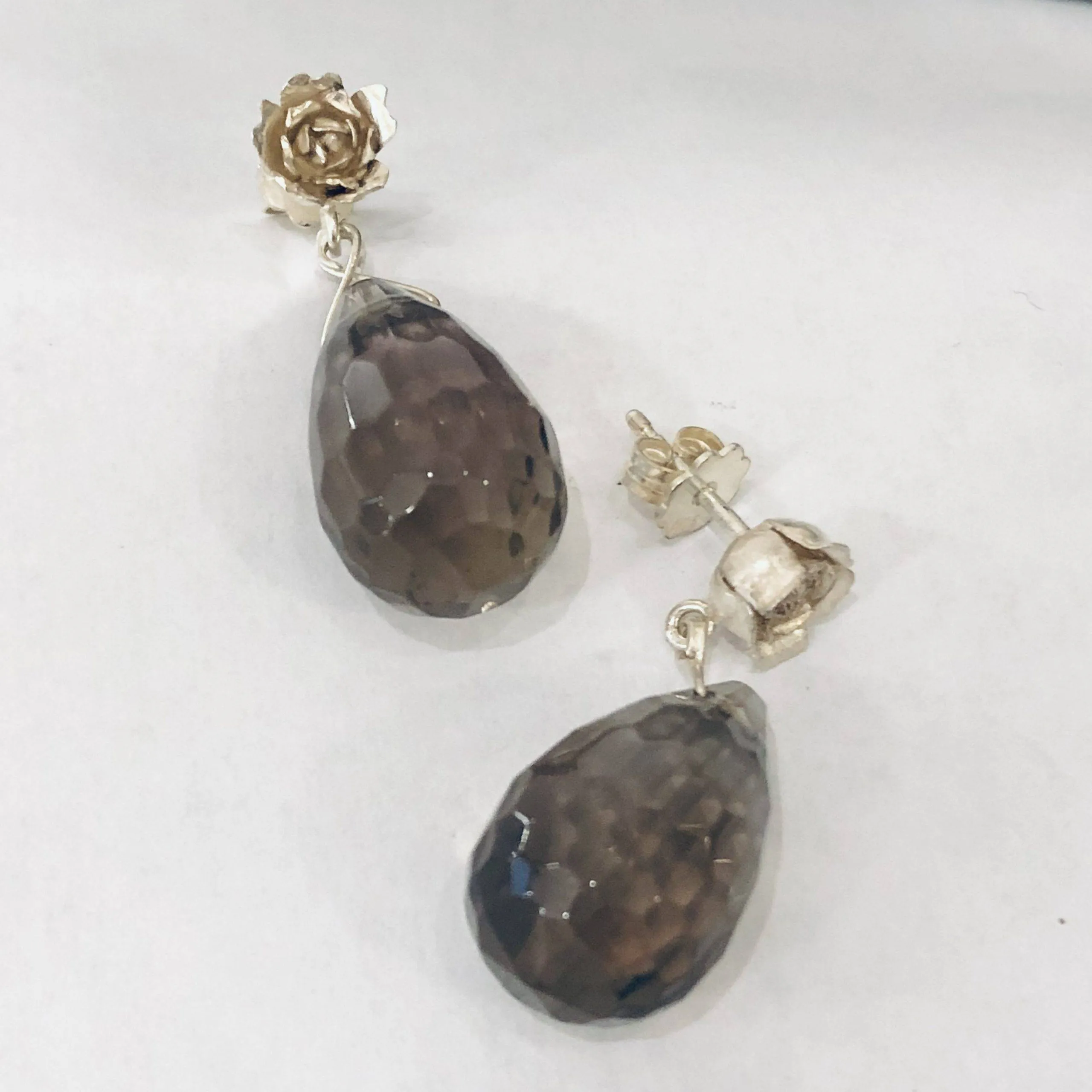 Ohrstecker Silberrose mit Rauchquarz. Die Steine haben einen ganz besonderen und außergewöhnlichen facetierten Schliff. Ein absoluter Hingucker.