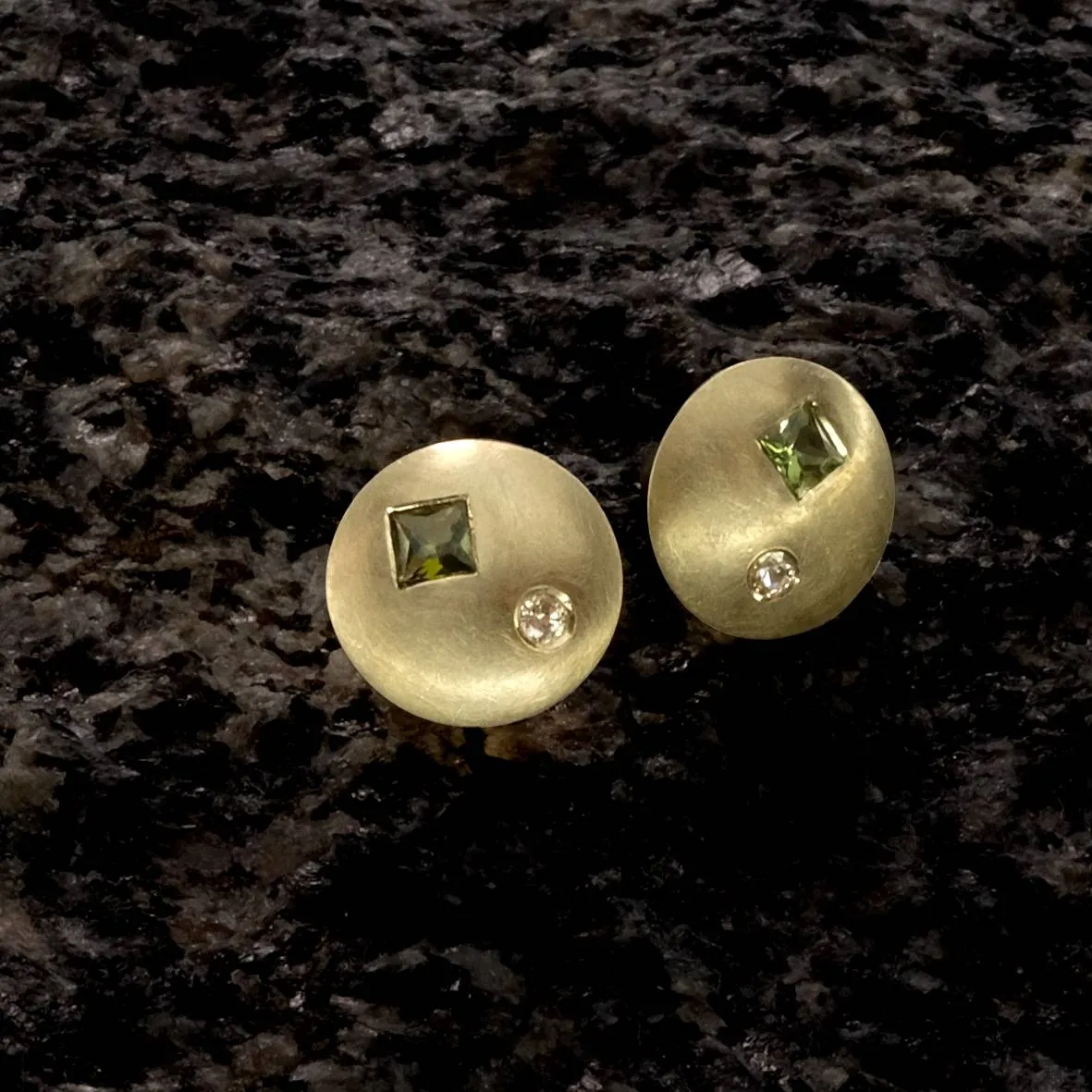 Ohrstecker, rund & gewölbt, 585/°°° Gelbgold und Saphir (rund) und Turmalin (eckig), Durchmesser ca. 11mm, Wölbungshöhe ca. 3mm
