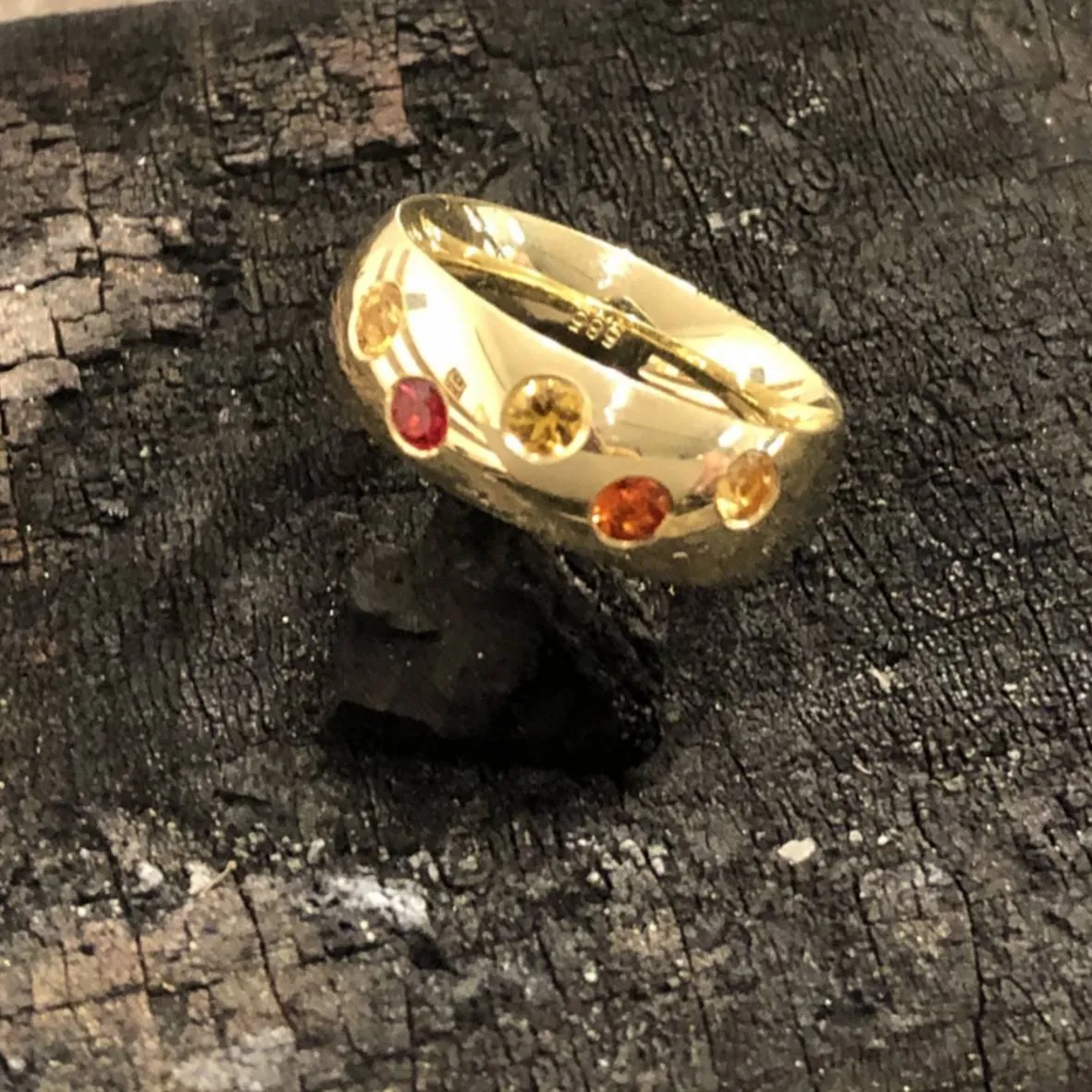 Wunderschöne seltene Saphire in gelb, orange und rot schmücken diesen zeitlosen Bandring.