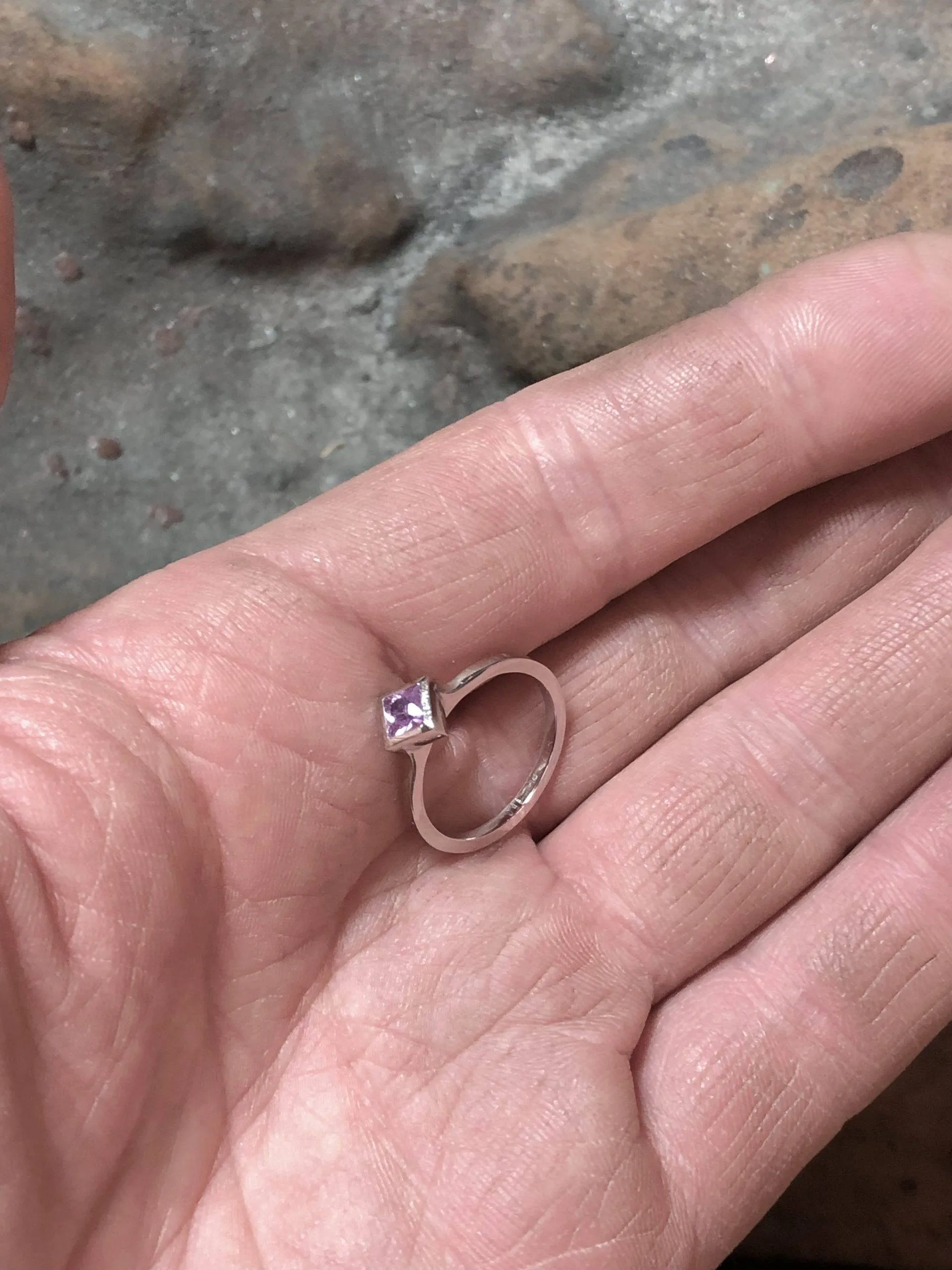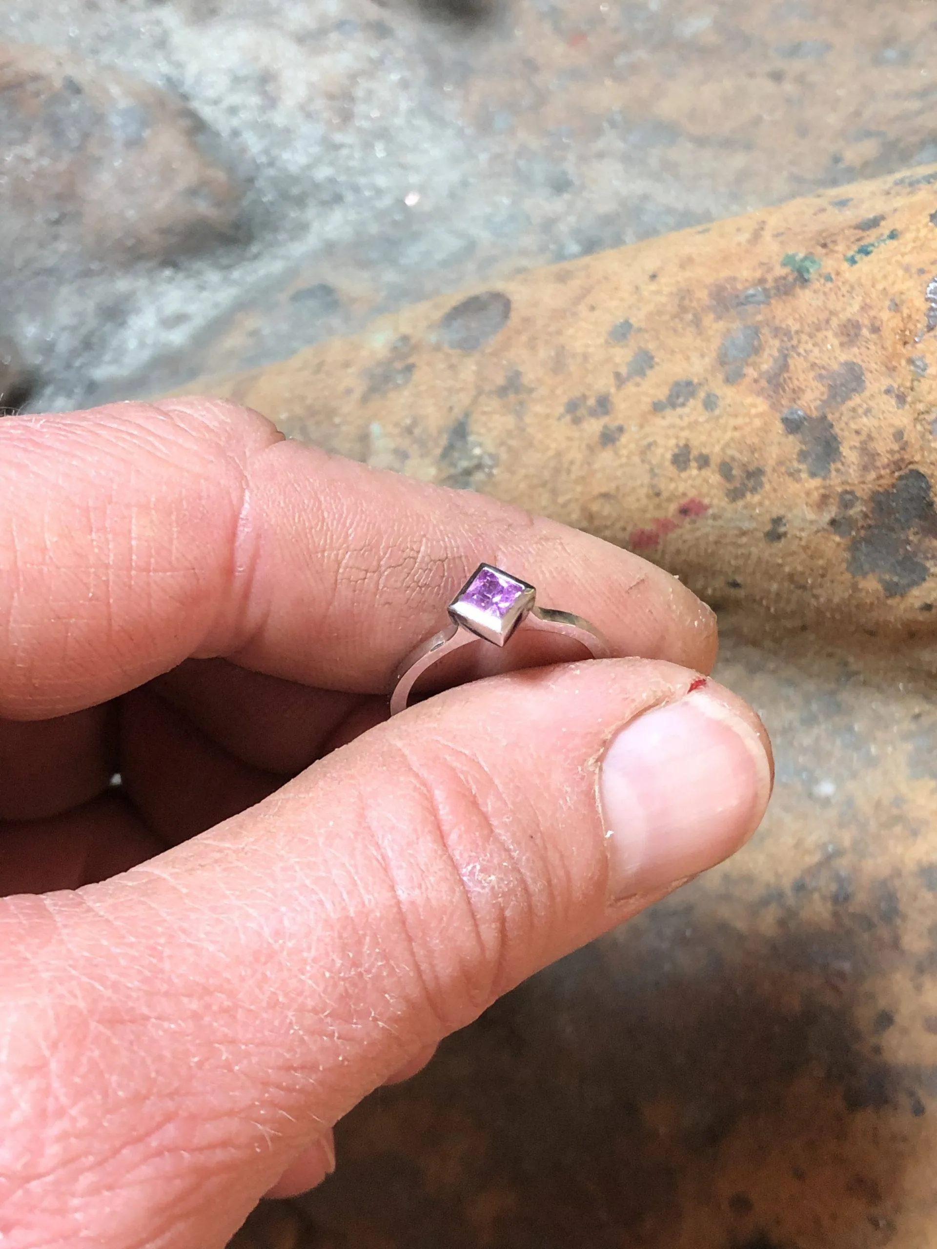 Hochglanzpoliert führt der schmale Ring hoch zu der kantigen Schüsselfassung und trägt oben den 0,39 karätigen Saphir, der von meinem Steinschleifer in Madagaskar geschürft und in Deutschland geschliffen wurde.