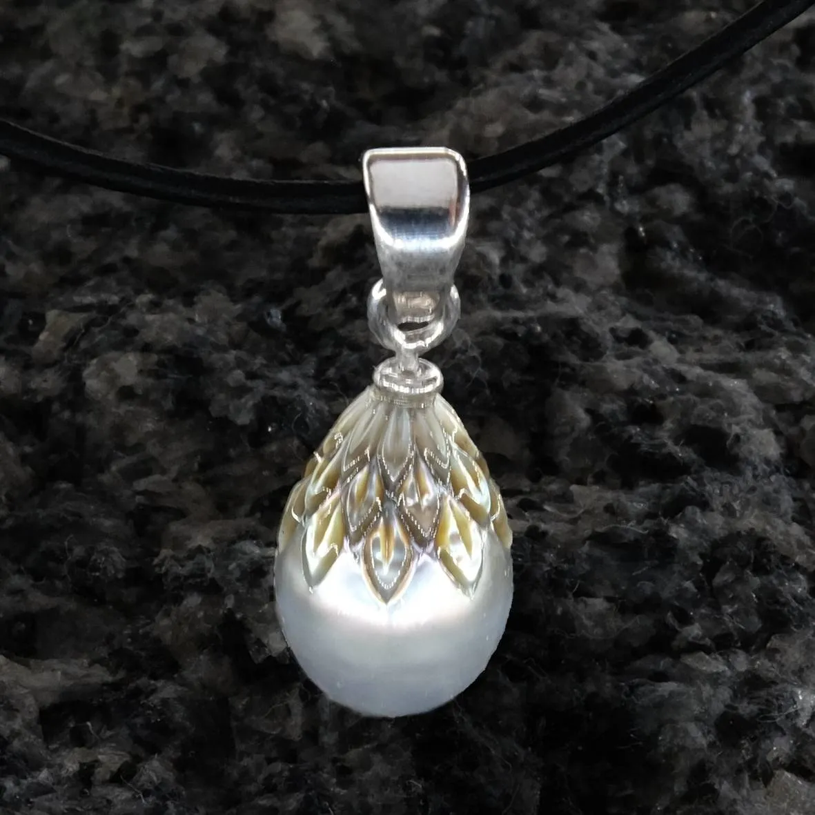 Rundherum ist eine tropfenförmige Tahitiperle noch zusätzlich zu ihrer Schönheit von Menschenhand veredelt. Eine feine Handgravur windet sich um die Perle herum. Gefasst von 750/°°° Weißgold. Selbstverständlich wie immer bei einer einzigartigen Perle ein Einzelstück.